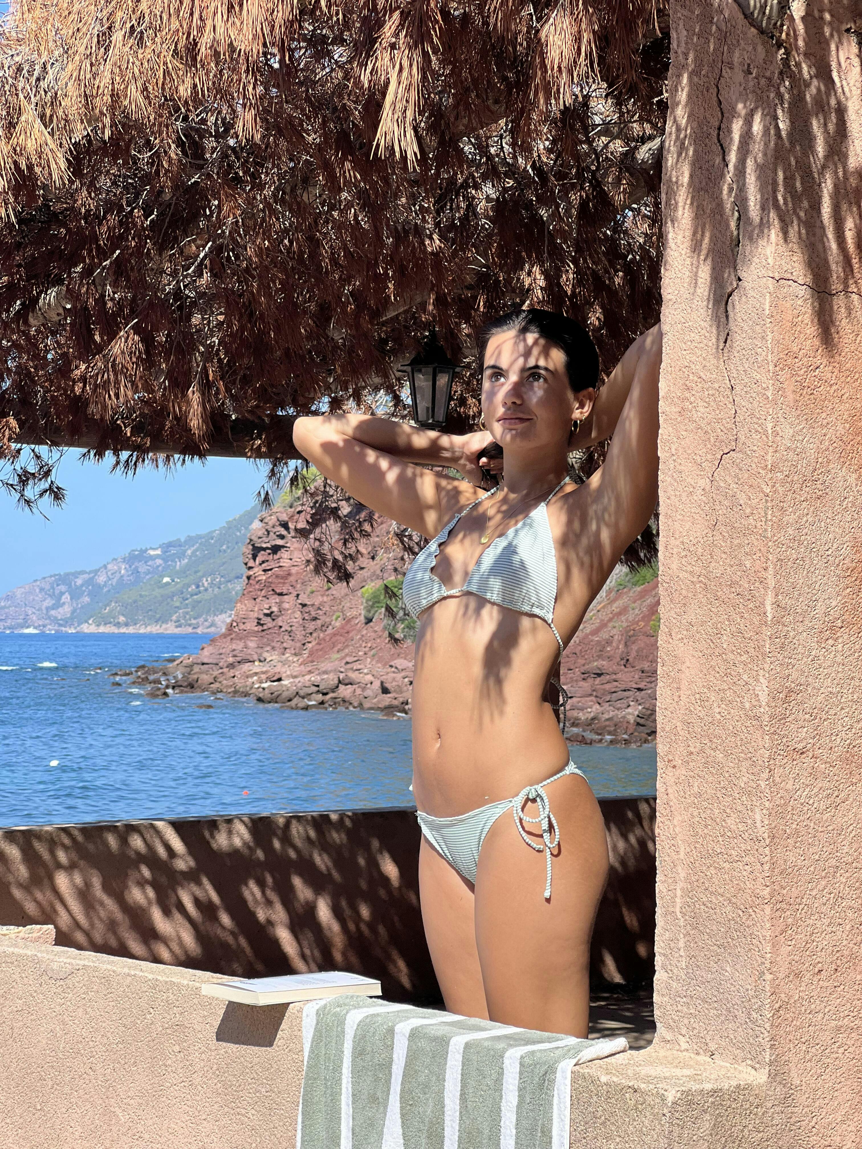Bikini con un bonito detalle de volantes que le da el toque de estilo. A rayas horizontales verdes y crudas. Aporta un ajuste perfecto gracias al cierre con lazada.